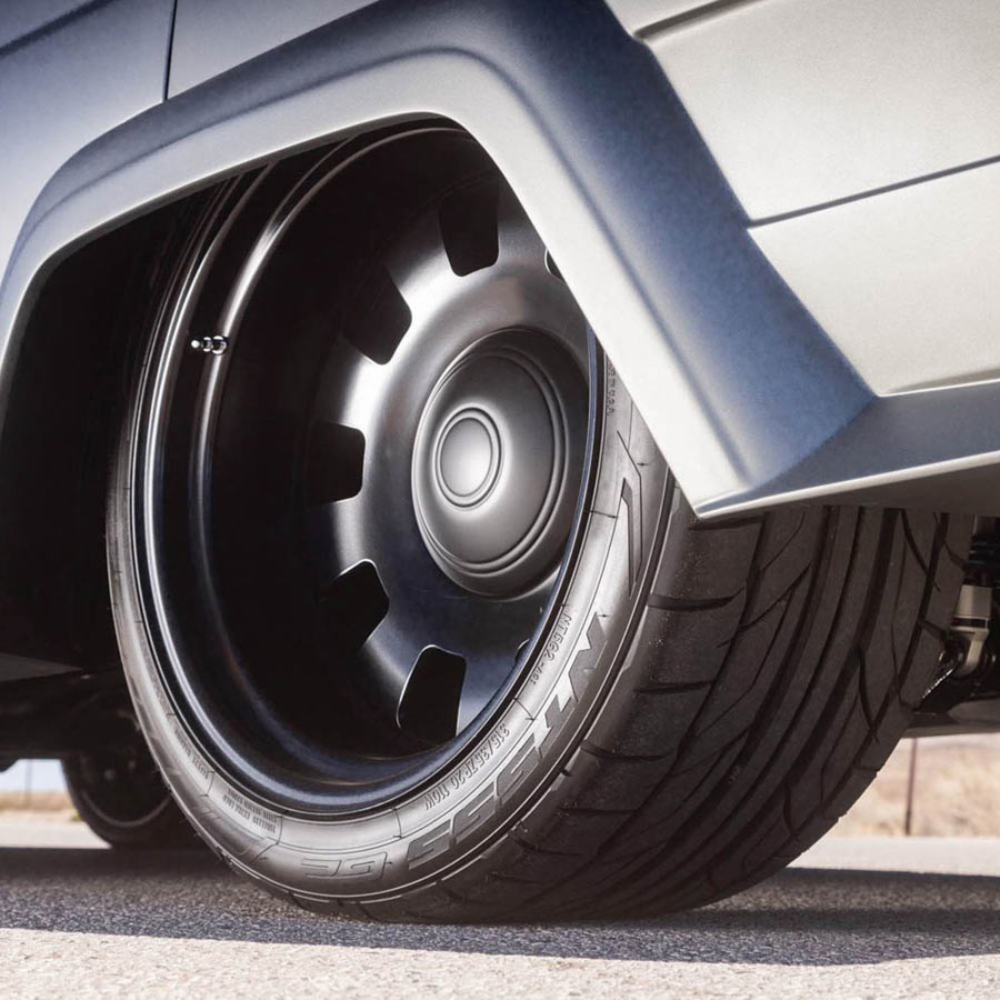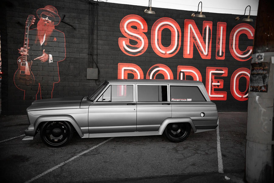 Finished in Pepper Grey and Nicknamed the "Chief," this 1975 Jeep Wagoneer built by Weaver Customs is powered by a twin-turbo 6-liter LS engine managed by a Holley Terminator X backed by 4L80E transmission. It rides on an independent front and 4-link rear end with RideTech adjustable coilovers on all four corners. Adding to its stance are 20-inch Detroit Steel Wheels wrapped in Nitto rubber. The custom chassis is coated in a gloss black. Weaver Customs utilized a 1965 Gladiator front end with inner pie pans transformed into turbo inlets. The full-custom interior is trimmed in Hydes leather featuring Dakota Digital gauges, Pioneer Audio and Vintage Air climate control. The "Chief" debuted on Hot Rod Magazine's Power Tour 2021 where it proved its street ability. It was then showcased in POR-15's booth at SEMA 2021. This Jeep is also a Goodguys award-winner.